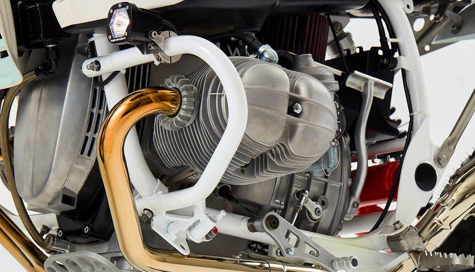 Сзади стоит модифицированное крыло HPN, оснащённое оригинальным задним фонарём и поворотниками и обрамлённое парой крепких кофров Hepco Becker - признанной классикой старой школы. Из других доработок стоит отметить литий-ионный аккумулятор от Shorai, заниженные подножки и пару ультраярких диодных противотуманных фар Baja Design S1 LED, установленных на дугах.
