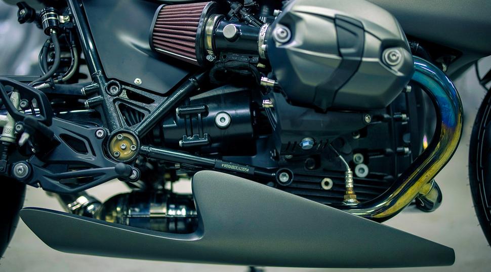 Оригинальная версия кастома существует в единственном экземпляре просто потому, что невозможно серийно изготовить настолько идеально сидящую капотировку (по крайней мере, за разумные деньги) - из облицовки торчат только цилиндры и выпускные патрубки, а всё остальное скрыто под ней. Так что силуэт мотоцикла с установленным комплектом для переделки снизу сглаживает очаровательная слегка оверсайзная защита картера, обрамляющая двигатель снизу в продолжение силуэту монокока над ним. Силуэт нижнего элемента подхватывает переднее крыло, в котором крепления заглублены в материал для максимальной гладкости. В комплект также входит набор небольших накладок, панелек и других мелких элементов, прикрывающих всё, что может отвлекать или нарушать плавность форм.