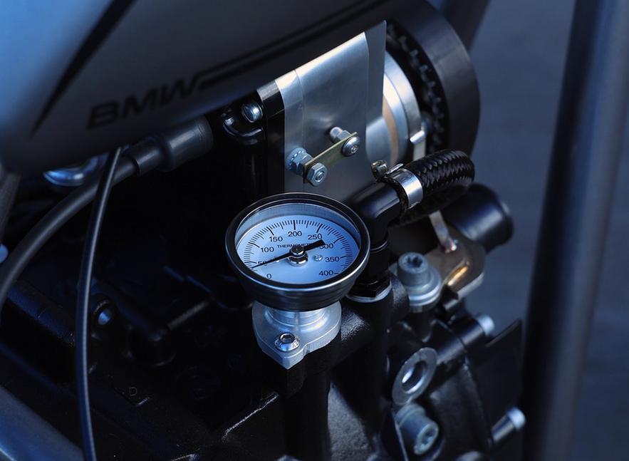 Самодельный руль девственно чист: Найджел установил на него только ручку газа Prism Supply. Тормоз тут только задний, нажимается правой пяткой, сцепление выжимается левой, а передачи переключаются ручным рычагом слева. В итоге всё было собрано и заработало - но на мотовыставку BMW в итоге не попал.