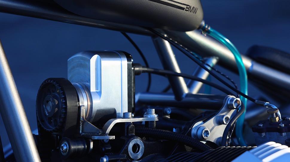 А вообще это довольно аналоговый мотоцикл, - рассказывает Найджел. -Заводское ЭБУ и система впрыска сняты, а вместо него - коммутатор и магнето от Morris, приводимые парой шкивов с сухим картером, что придаёт всей этой конфигурации спортивный аспект. Я хотел, чтоб всё это походило на гоночный нагнетатель из 60-х, и получилось очень похоже.