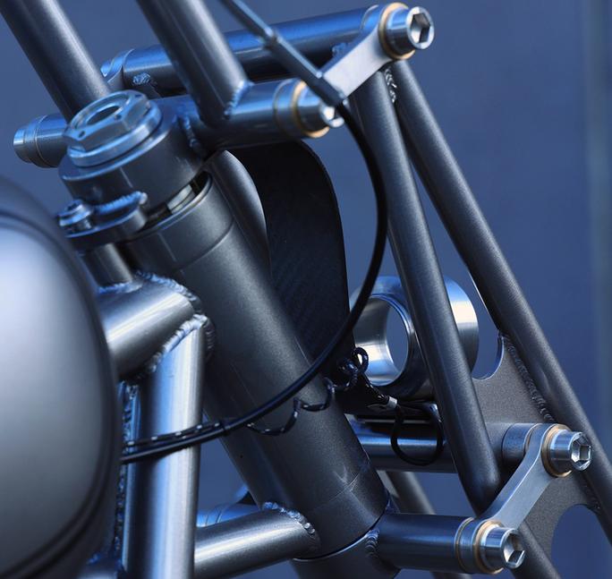 Рама полностью самодельная из хром-молибденовой стали и имеет съёмные нижние элементы для облегчения снятия двигателя.