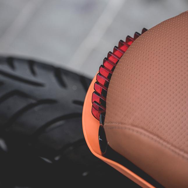 Вместо традиционной задней петли мастера из Auto Fabrica решили сделать мотоцикл более стильным, поэтому теперь функции заднего фонаря выполняют акриловые пластины. Под стоп-сигналом была установлена изогнутая оранжевая панель из алюминия.