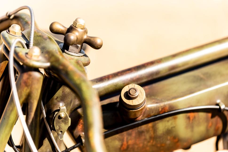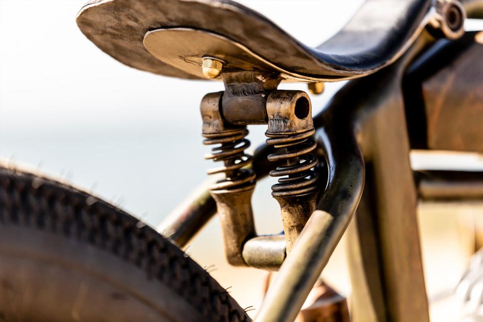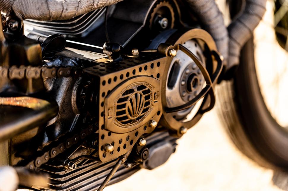 Медные элементы, псевдо-проточная система смазки, искусно сконструированные ножные рычаги—все это придает мотоциклу особый шарм. Но заключительный этап работы требовал особых умений, которыми обладают мастера из Buba Custom Paint. Они смогли придать разношерстным деталям единый вид с налетом патины. Это был переломный момент всего проекта. Но, как вы можете видеть, совместные усилия Kacerwagen Cycles и их друзей оправдались.