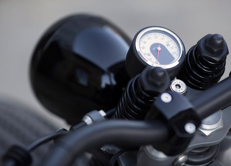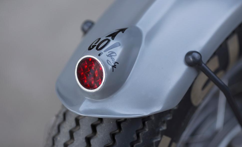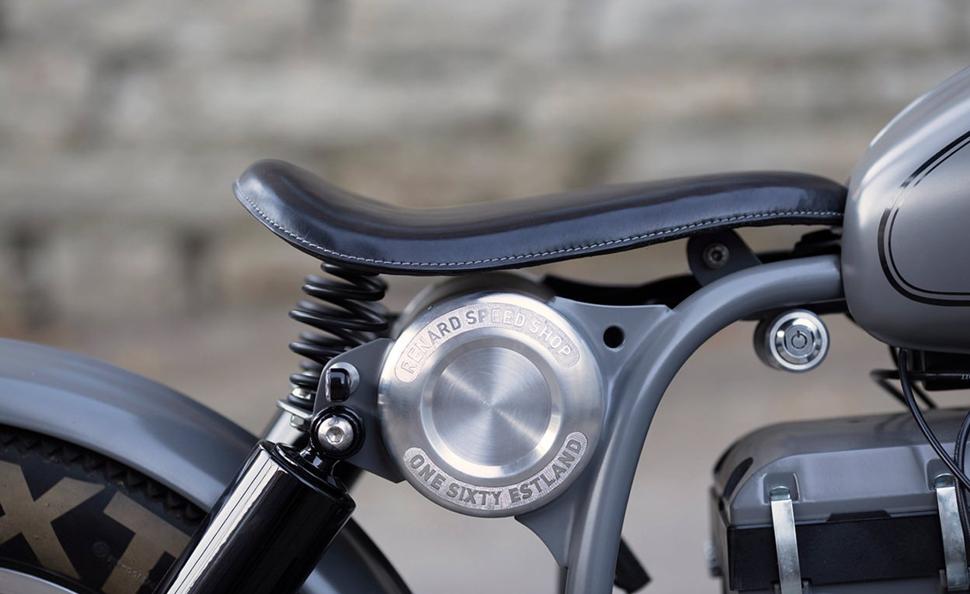 Мастера Renard также убрали все лишнее сзади, переделали крепления амортизатора. Металлический цилиндр под сиденьем выглядит как винтажный масляный бак, но на самом деле это конструкция предназначена поддерживать крепления амортизатора. К тому же этот цилиндр полый внутри, поэтому его можно использовать для хранения сумки-скрутки с инструментами. Прекрасным завершением задней части стало роскошное ребристое крыло. В него встроен светодиодный хвостовой фонарь, существующий в единственном экземпляре. Сиденье также было изготовлено на заказ. Оно установлено на пружинах, закрепленных сзади кронштейнов амортизатора.
