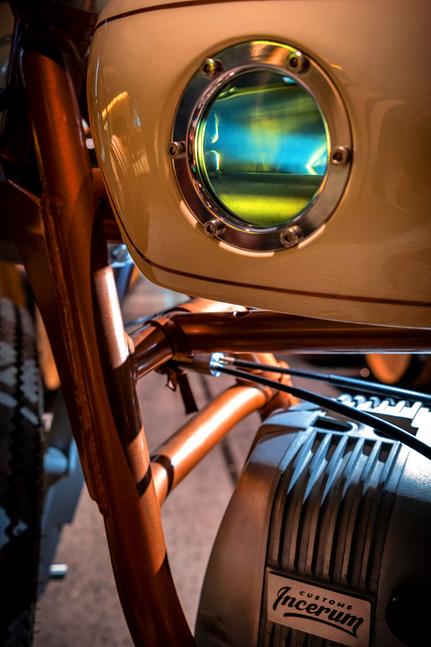 Закончив со сваркой, парни всё зачистили, выгладили и сняли лишние крепления, а затем отправили на пескоструй и покраску. По цветам была выбрана глянцевая медь для рамы и глубокий кремовый для остальных элементов шасси - всё выполнено порошковой краской. Затем настало время бака, хоть и маленького, зато крайне симпатичного и привлекающего внимание. Самодельный бак оснащён большими смотровыми окошками по бокам, через которые видно плещущийся внутри бензин. Сверху его украшает резьбовая крышка на довольно высокой горловине.