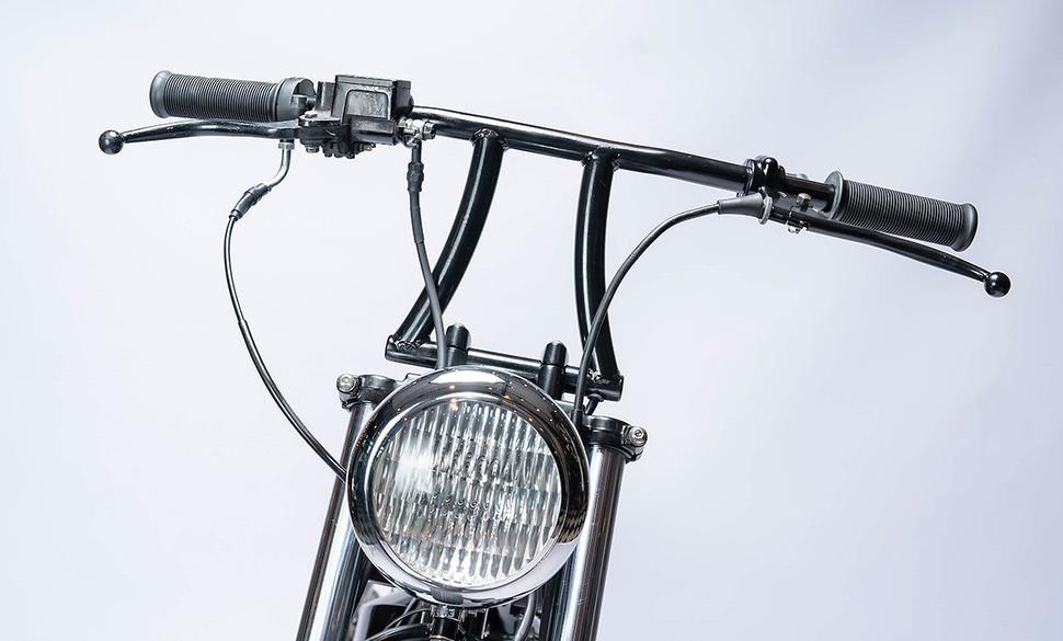 Органы управления, начиная с руля - тоже во многом уникальные: самодельный руль обут в грипсы Biltwell Inc. и украшен миниатюрными пультами с внутренней проводкой. Спидометра вообще нет, а есть только маленькая хромированная фара спереди на кастомном креплении.