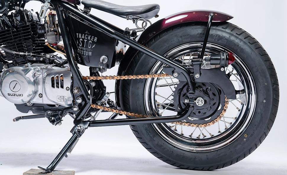 Рама Suzuki была порезана и переделана, жёсткий зад оснащён классической системой натяжения цепи в духе Harley. В результате передняя часть стала даже выше, чем сейчас, поэтому STG стали искать более короткую и толстую вилку, чем штатная хлипкая вилка GN. Идеальным донором стал Honda CBX250.