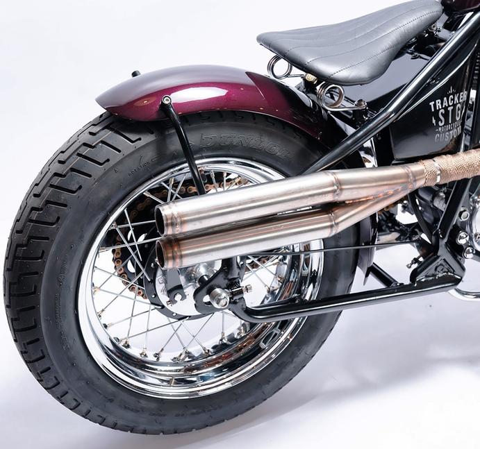 Когда-то STG делали похожий боббер на основе GN125, но у него была задняя подвеска. Герман ещё до создания STG построил несколько сухих рам, так что считался опытным в хардтейлах, и они с Марсело решили взять всё лучшее из своего прошлого боббера, но сделать настоящий и даже слегка преувеличенно суровый винтажный боббер без задней подвески.