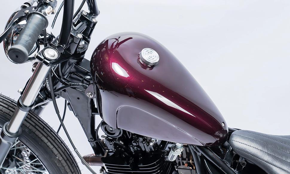 Несмотря на свой забавный в общем-то внешний вид, кастомный Suzuki GN250 отличается высоким качеством отделки: глубокая бордовая краска с потаённой искрой отлично дополнена чёрным порошковым покрытием на большинстве твёрдых частей и несколькими блестящими элементами для контраста. И слегка кичливый, но стильный и занятный боббер от STG станет любимым повседневным мотоциклом для своего верного хозяина.