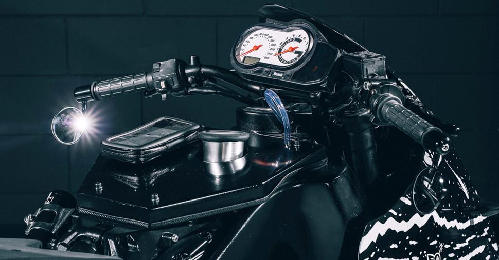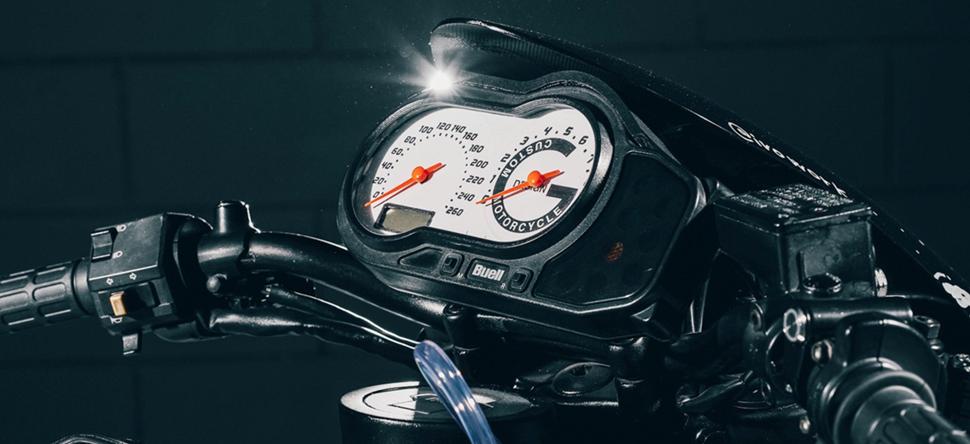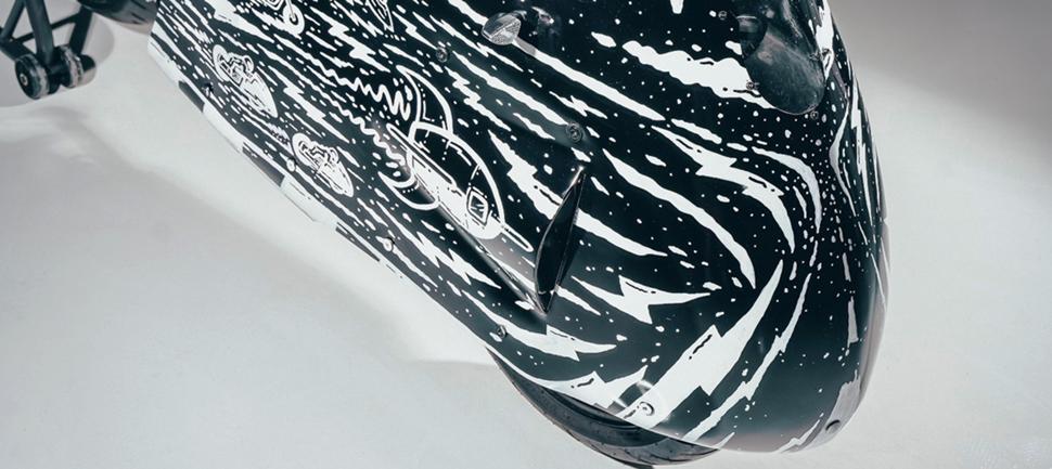 НЛО и ракеты, кастомные мотоциклы и кометы испещряют небо, нарисованное белой краской на на чёрном обтекателе Buell-а. На фоне графичной картинки практически теряются небольшие поворотники на ножках.
