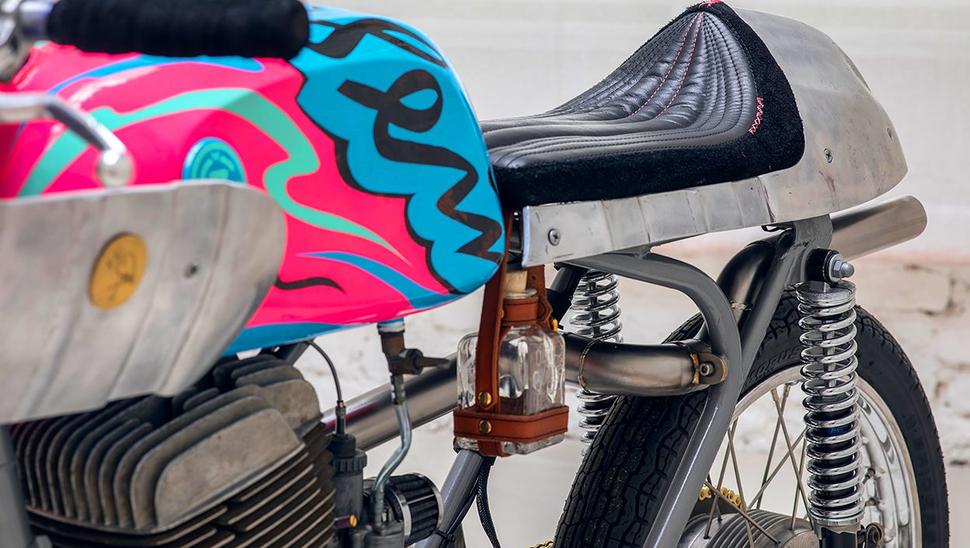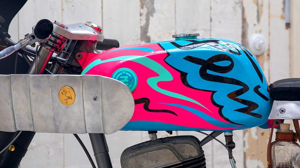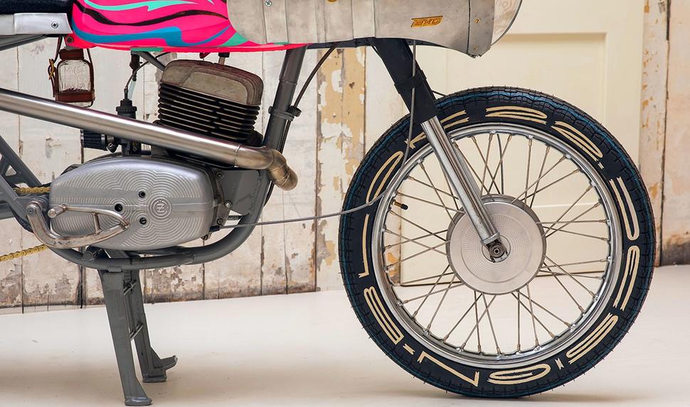 Бак весёленькой расцветки был раскрашен вручную, его дополняет довольно строгое кожаное сиденье, при ближайшем рассмотрении оказывающееся отстроченным розовыми стежками. Ещё более внимательный взгляд обнаружит гравировку на корпусе двигателя, ступицах колёс и других участках. Бронзовые значки украшают обтекатель, а передний "пузырь", закрывающий фару - из настоящего чешского стекла, форму которому придали традиционными методами.