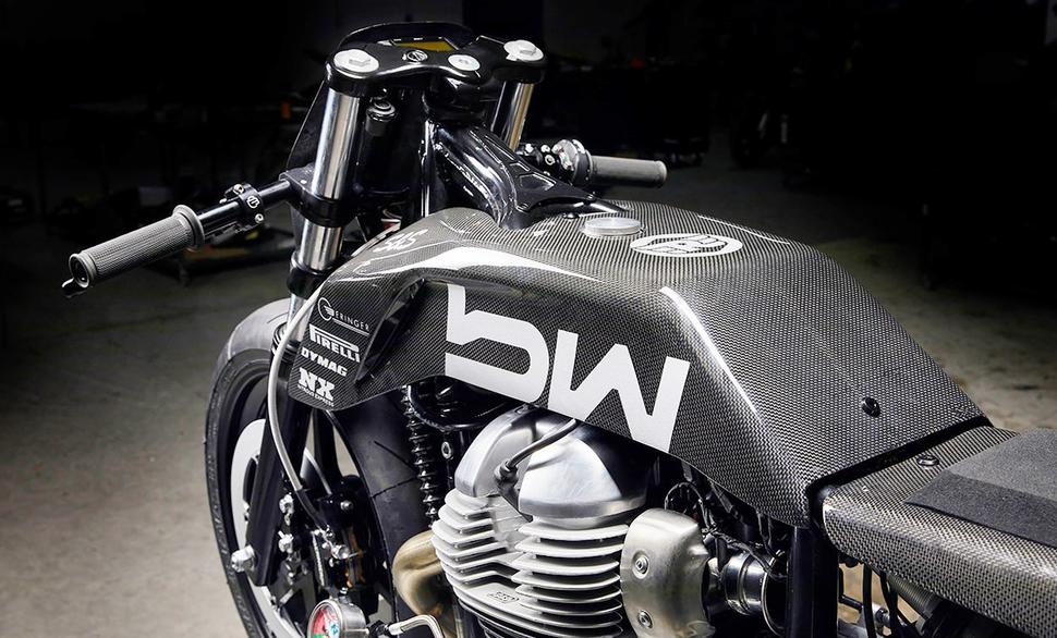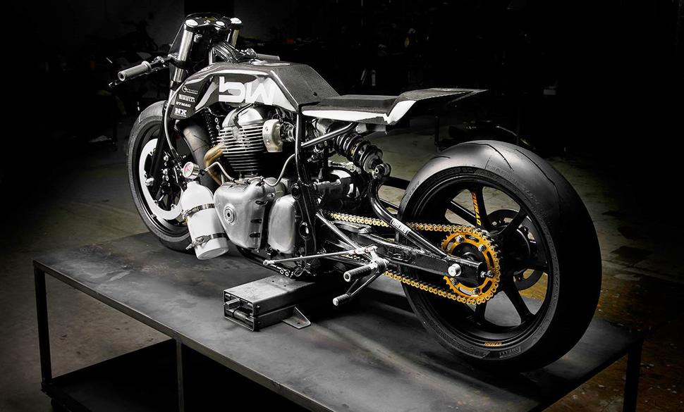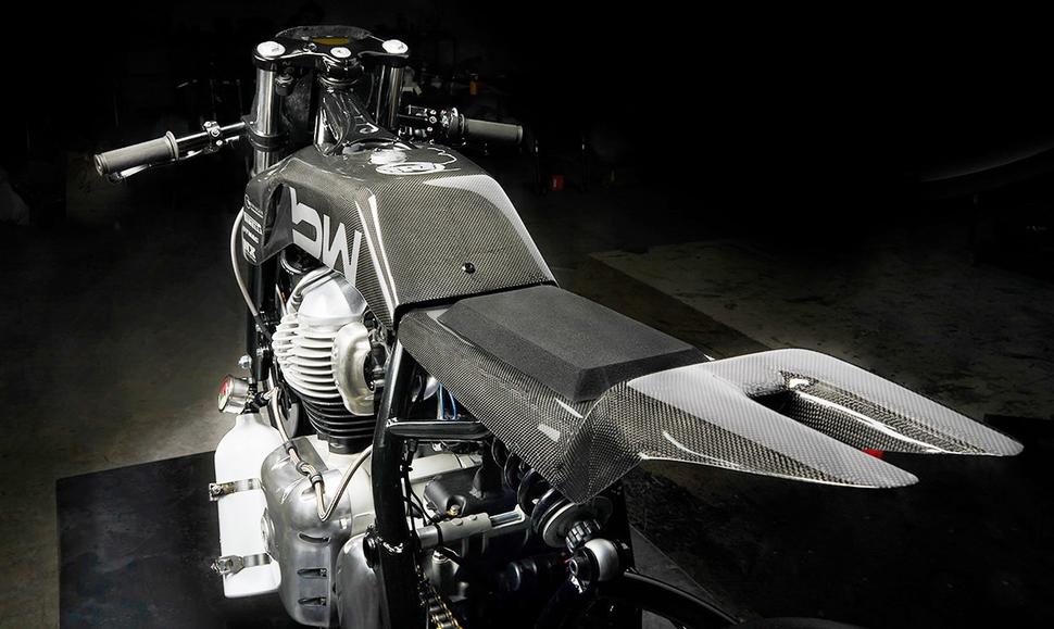 Как большинство гоночных мотоциклов, этот Royal Enfield Continental GT 650 с гордостью носит логотипы спонсоров. Но в отличие от большинства, они представлены не цветастой мозаикой, а светло-серой графикой: Bad Winners сохранили монохромность мотоцикла, покрыв карбон прозрачным глянцевым лаком.