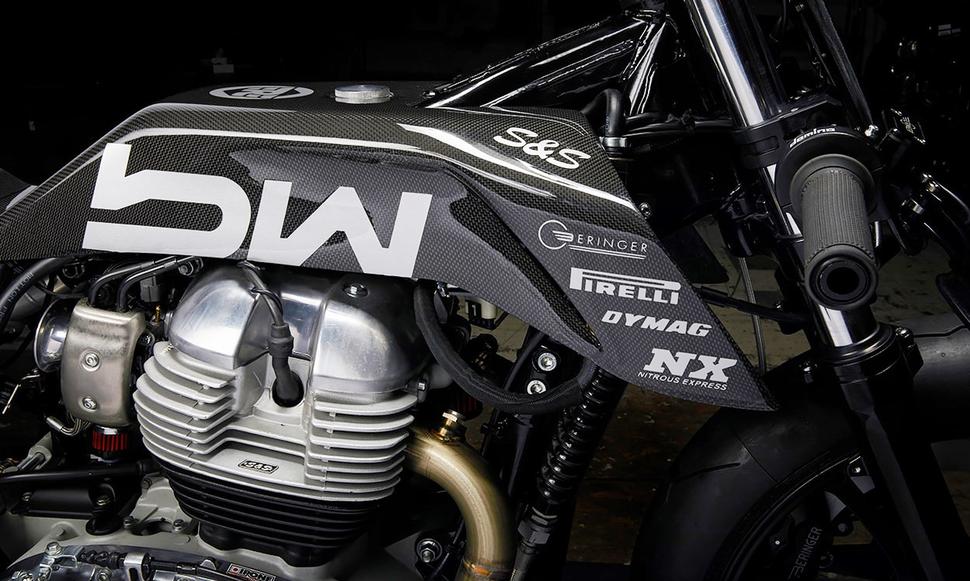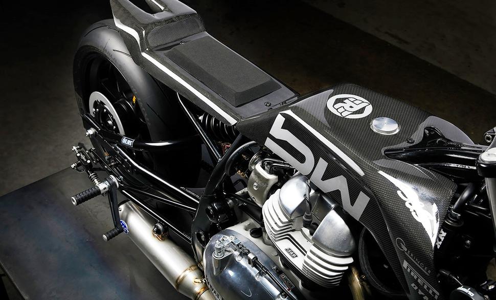 Мотоцикл по кличке "Pegasus l’Étalon Noir", что означает "Чёрный жеребец Пегас", получился низким, длинным и изящным - заманчивое сочетание карбона и высокопроизводительного тюнинга. Здесь кубатурный комплект на 865 кубиков от американцев S&S Cycle с улучшенным распредвалом, шатуны Carillo, усиленное сцепление. Над головкой блока цилиндров тоже потрудились S&S, а заодно предоставили Bad Winners выхлоп 2-в-1 и программируемое ЭБУ.