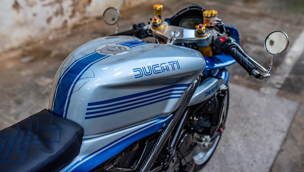Заводской бак Ducati 848 остался, но был слегка доработан, как и расположенные под ним впускные воронки, выглаженные и зарешёченные. Для плавного перехода от середины мотоцикла к великолепному хвосту Жереми решил сделать этот элемент цельным, включив в него всё - от выходного отверстия выхлопа и удлиннённого корпуса заднего фонаря до бака. Для этого он обратился к специалистам по фиберглассовому композиту FF PRODESIGN, которые занимаются как раз заказной капотировкой для автомобилей. И пусть этот элемент поменьше, чем более привычные им детали, но сил в него было вложено не меньше, и результат получился великолепный.