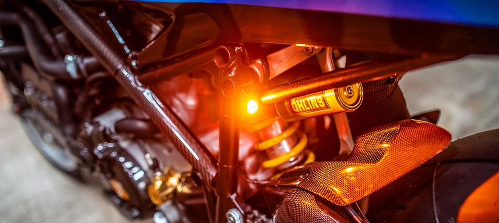 Пришла пора ставить Ducati 848 на ход, и для этого были приобретены самые лёгкие колёса из линейки и окрашены в заводской металлик. Вилка от Showa была перебрана и анодирована в золото, а преобразивший управляемость и так великолепного спортбайка задний амортизатор от Ohlins из топовой линейки был тщательно и точно настроен под вес райдера. Чтоб дополнительно снизить массу мотоцикла, всю светотехнику перевели на диоды, а аккумулятор заменили на литиевый. Лопухастые заводские зеркала сменили на аккуратные классические, установленные в торцы руля.