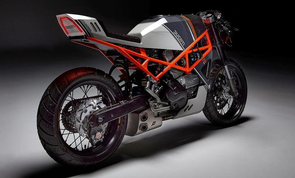 Энтони нравится сама идея расширения границ кафе-рейсеров, и он решил модифицировать свой собственный Monster 600 1994 года, превратив его в "ретро-но-современный вариант кафешника". И ещё он хотел проверить границы классических элементов стиля и техник, например, лепки из пластилина, используя современные идеи и материалы. Немного карбона, угловатые линии, нейтральная расцветка, и, конечно же, культовая решётчатая рама в центре всего.