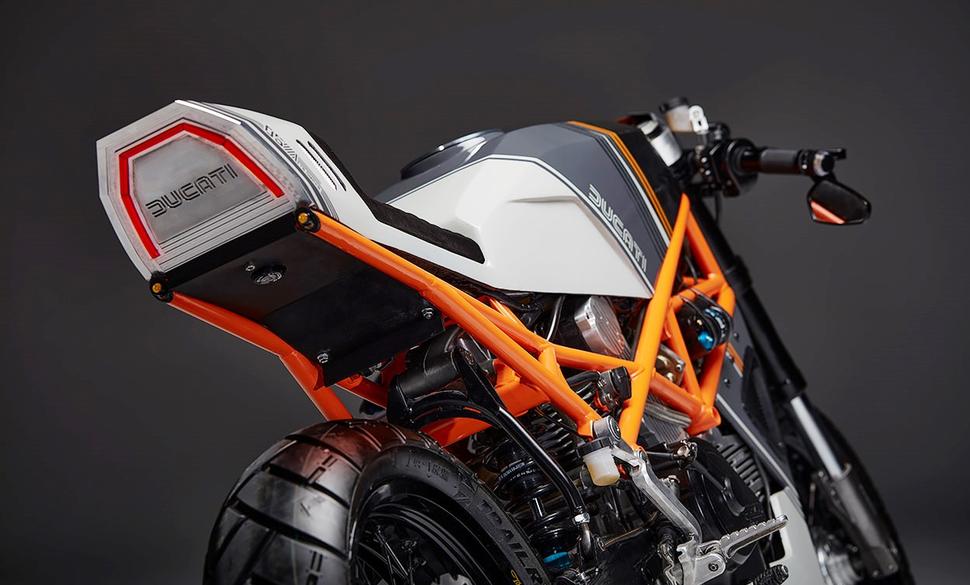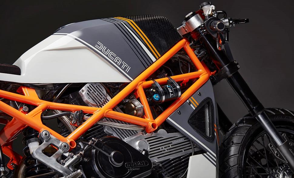 Энтони укоротил заднюю часть рамы Ducati Monster 600 для того, чтобы сделать вид сбоку подтянутым, а бак удлинил на 10см для более спортивной посадки. Новый бак установлен на 8см ниже штатного и более тесно обнимает воздушный фильтр. Прямо за баком - кастомное седло, обшитое чёрной алькантарой с оранжевой прострочкой, перекликающейся с яркой рамой. Ниже седла - моноамортизатор TFX с выносным резервуаром, аккуратно прикреплённый к раме.