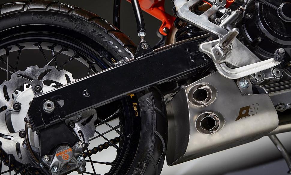 Необычная выхлопная система под названием Ex-Box создана итальянским производителем QD. Она скрывает несколько специально настроенных акустических камер, ограничивающих децибелы, но не препятствующих потоку газа. Её низкая установка позволила не перекрывать силуэт мотоцикла.
