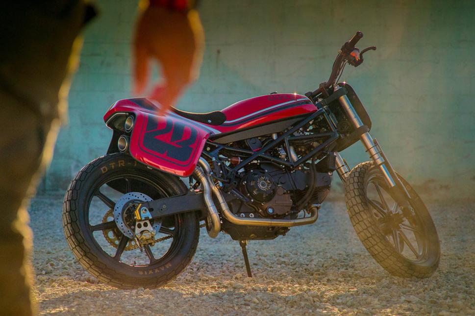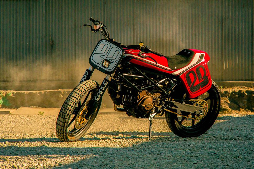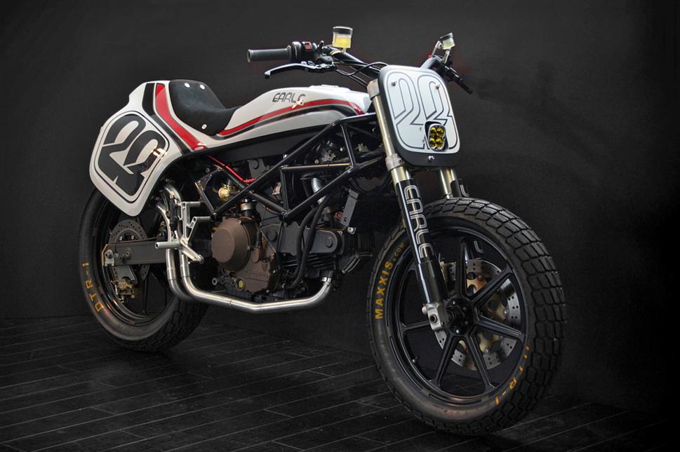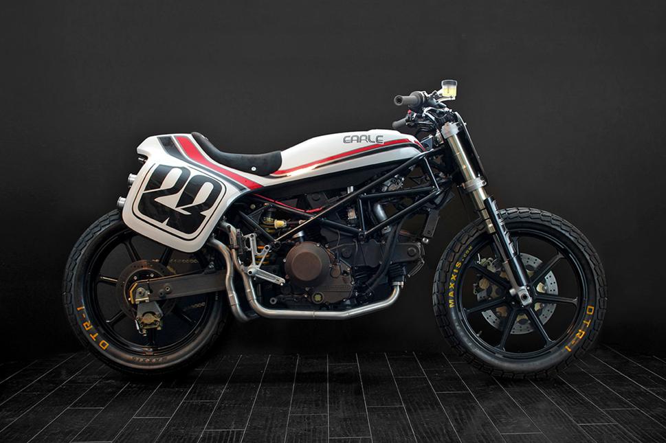 Концепт прост—легкий, современный трекер с передовой конструкцией из углеволокна. Эрл говорит, что данный мотоцикл стал прекрасным образцом совпадения его личных интересов: прекрасный силовой агрегат Ducati, огромные колеса, обутые в агрессивную резину, ввысоке седло и чистые пропорции флэт-трекера.