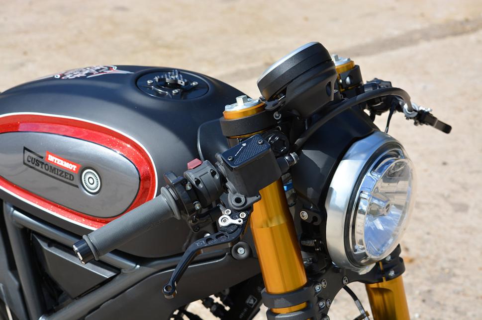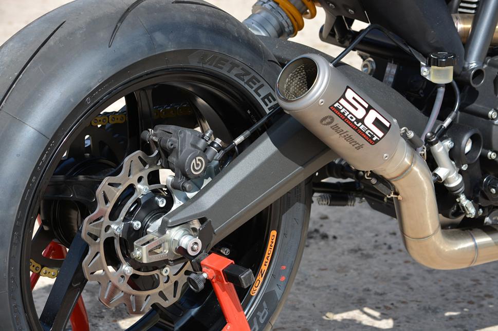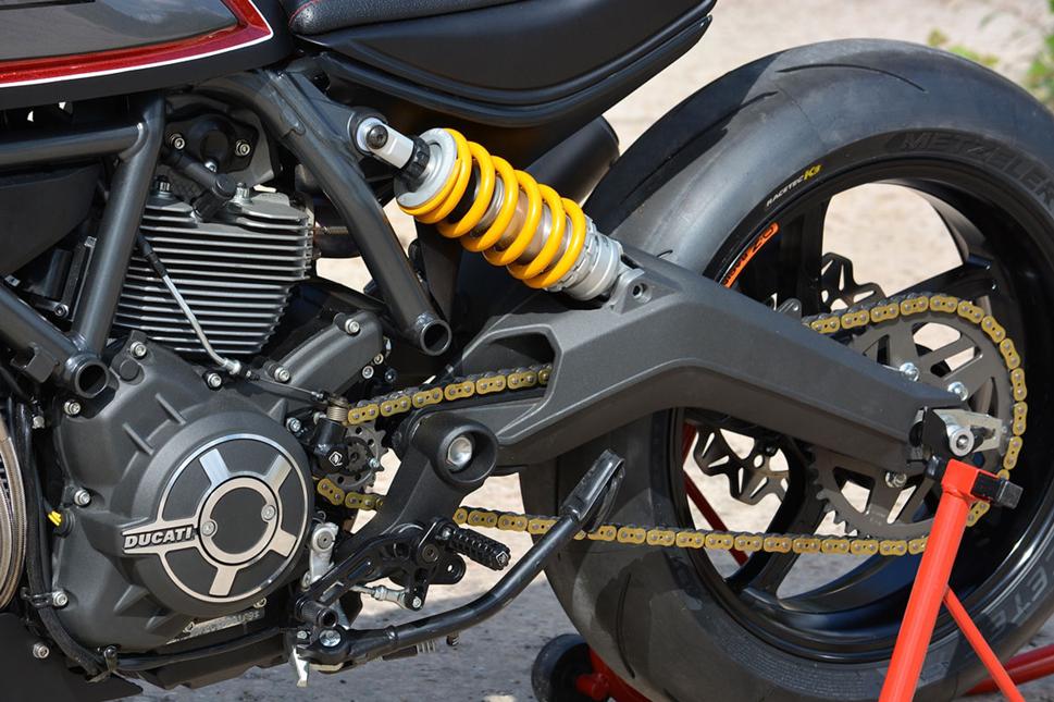 Для работы над подвеской Вальц обратился к другому специалисту, знаменитому в кругах мотоспорта: Öhlins. Он выбрал вилки от Panigale 1199R, укоротил их, чтобы сохранить геометрию байка, и установил уникальные внутренние части. Задний амортизатор также кастомный, он состоит из 12 компонентов от различных амортизаторов Öhlins. Только такую конструкцию удалось установить в узкой задней части мотоцикла.