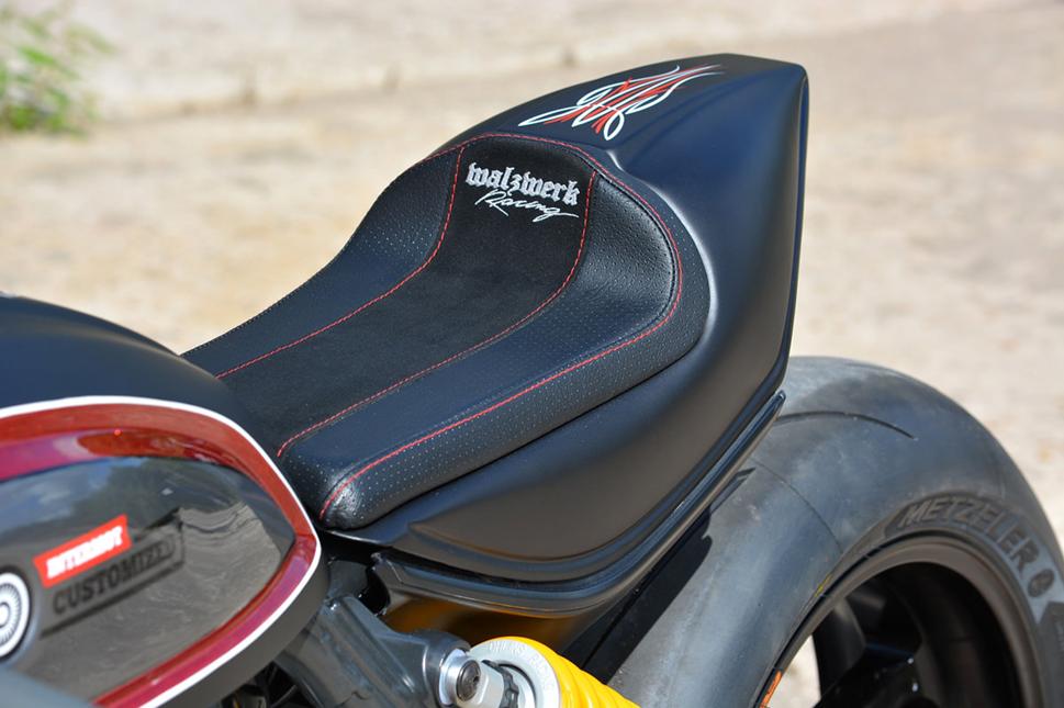 Вальц решил установить на мотоцикл регулируемый клип-он Gilles и подножки DucaBike, чтобы поддержать спортивную сущность байка. Седло и хвостовая часть были сделаны вручную из листового алюминия, а вот топливный бак оставили стандартный, но, как следует, над ним поработали. Покраска Porsche: матовый черный и глянцевый серый, с акцентом цвета карамелизованного яблока.