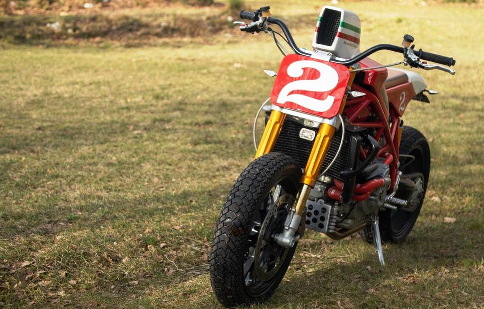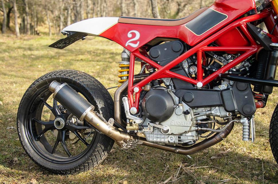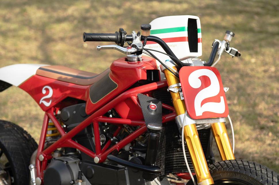 Донор, Ducati 996, был приобретён другом Маркуса у местного дилера, и с этого начался проект. Отточивший свои навыки на концепте Husqvarna V1000, Маркус ощущал в себе готовность к более амбициозному проекту, который, нравится он вам или нет, для автора стал большим достижением, с учётом того, что это всего лишь второе его изделие. Цельный карбоновый обвес выглядит великолепно, а форма изогнутого хвоста сама по себе достойна всяческих похвал. В результате у Маркуса получился действительно уникальный мотоцикл - не просто отличающийся от других одноклассников, а абсолютно своеобразный, на который не похож ни один другой мотоцикл в мире: спортбайк от Ducati в обвесе для флэт-трекера, стилизованном под Formula 1.