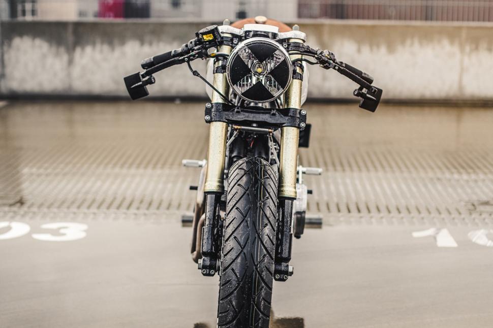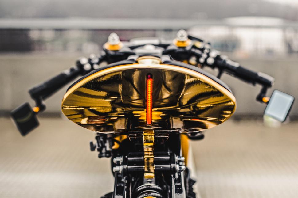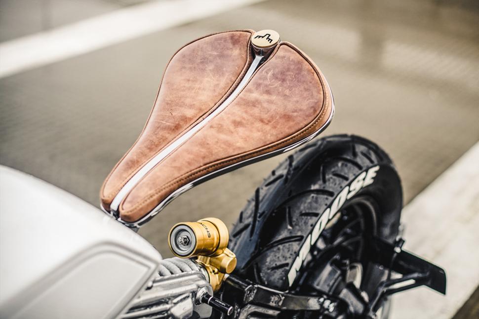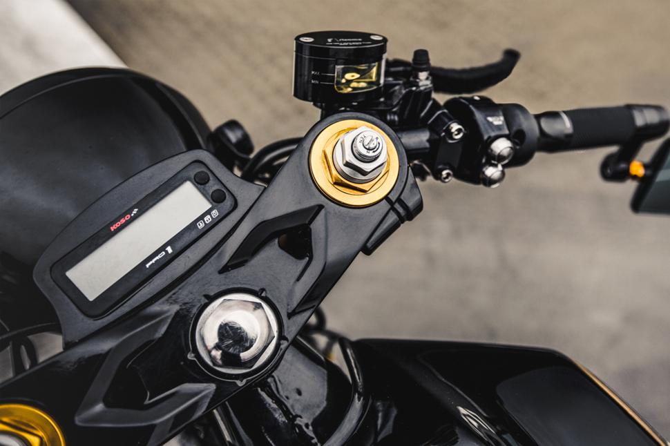 Верхнюю траверсу модифицировали таким образом, чтобы в нее можно было встроить приборную панель Koso Pro в специальном корпусе. Зажигание перенесли в стандартный проем рамы. Что касается задней подвески, то Том решил, что лучшим вариантом станут амортизаторы Sachs от мотоцикла MV Agusta. Их разобрали и покрасили пружины в цвета, сочетающиеся с топливными баками.