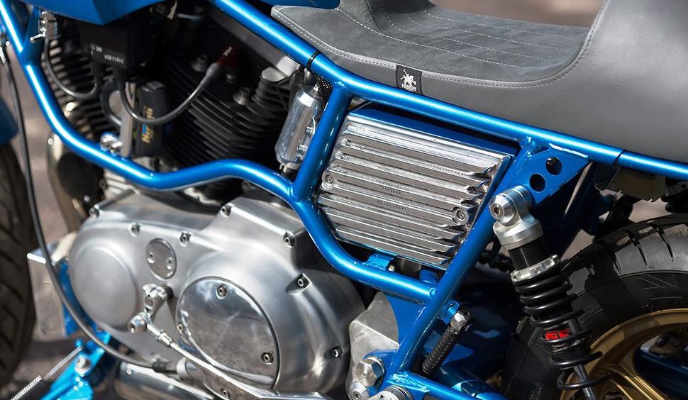 Под седлом расположен самодельный маслобак большей, чем штатный, ёмкости, а также отсек электроники. В нём расположен литий-ионный аккумулятор Magneti Marelli и центральный контроллер Motogadget mo.unit, на котором основана вся бортовая сеть мотоцикла.