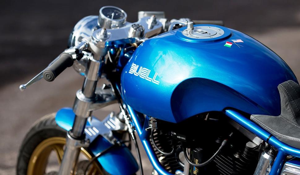 Изначально Том планировал классическую красную окраску, как подобает Ducati, но клиент настоял на синей. Том выбрал классический цвет Shelby Daytona - Guardsman Blue, который мастерски нанесли S.Jago Designs. Логотип Buell был воссоздан исторически достоверным шрифтом Ducati, а флаги Америки и Италии, нанесённые на верх бензобака, символизируют смешанные корни мотоцикла.