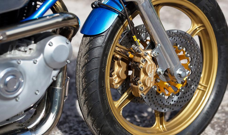 Геометрия рамы основана на оригинале от Buell, - объяснил Том. -Но колёсная база примерно на 25мм длиннее. На 18-х колёсах с более узкой резиной он на удивление уверенно идёт и расслабляет при езде. Настолько расслабляет, насколько возможно, когда ты испытываешь что-то, во что вложено столько труда за такое долгое время.