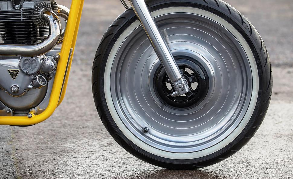 Рама сухая сзади и оснащена траверсами с вилкой от Harley Sportster 2001-го года спереди. Ездит она на восстановленных колёсах от Harley V-Rod с тормозными дисками из нержавейки, суппортами от современного Triumph и самодельными армированными тормозными магистралями.