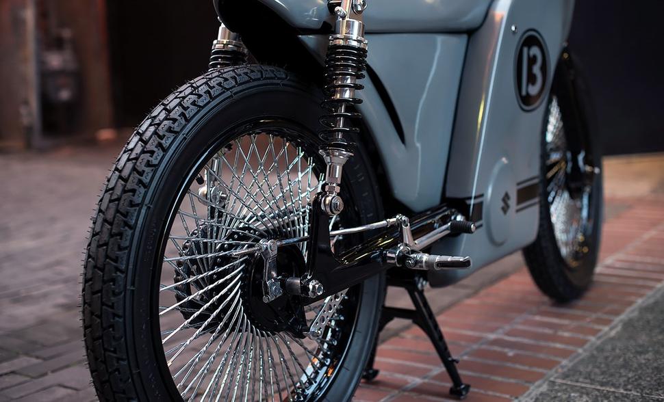 Сзади стоит пара фрезерованных алюминиевых регулируемых амортизаторов с газовым подпором. Колёса - кастомные, на ступицах от Honda CD125, 18-дюймовых ободах и витых спицах. Салли установил и тормоза от CD125, но улучшил их с помощью карбоново-кевларовых колодок.