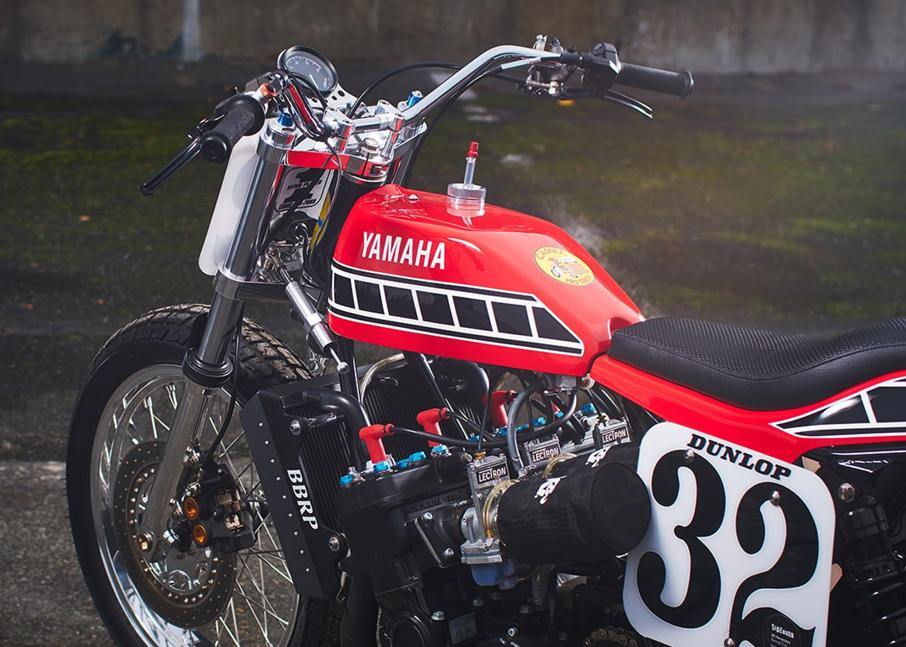 Как и большинство флет трекеров, Yamaha TZ750 оснащен вилкой от модели YZF-R6, соединенной с рамой посредством кастомных траверс. От этого же мотоцикла был взят передний тормоз, включая передний суппорт и передний диск с креплением.