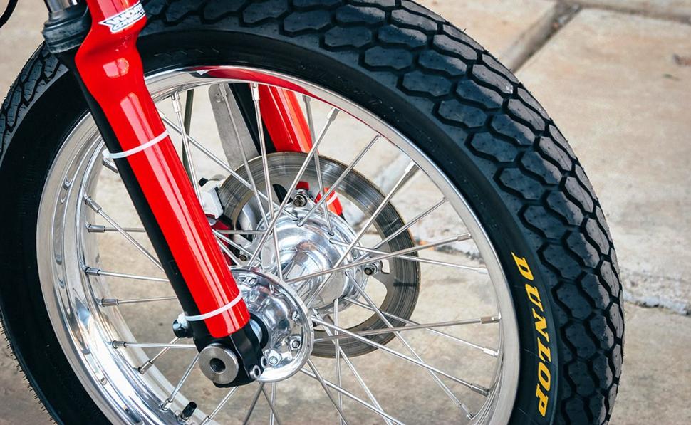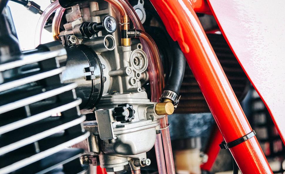 Движок Honda XR600R сразу работал как надо, так что Джастин занялся доработкой впуска. Он установил новенький карбюратор Keihin CR на 38 мм, доработанный с помощью компонентов от Tokyo Mods. Фил изготовил новый выхлоп (для красоты налепив на него наклейку Yoshimura).