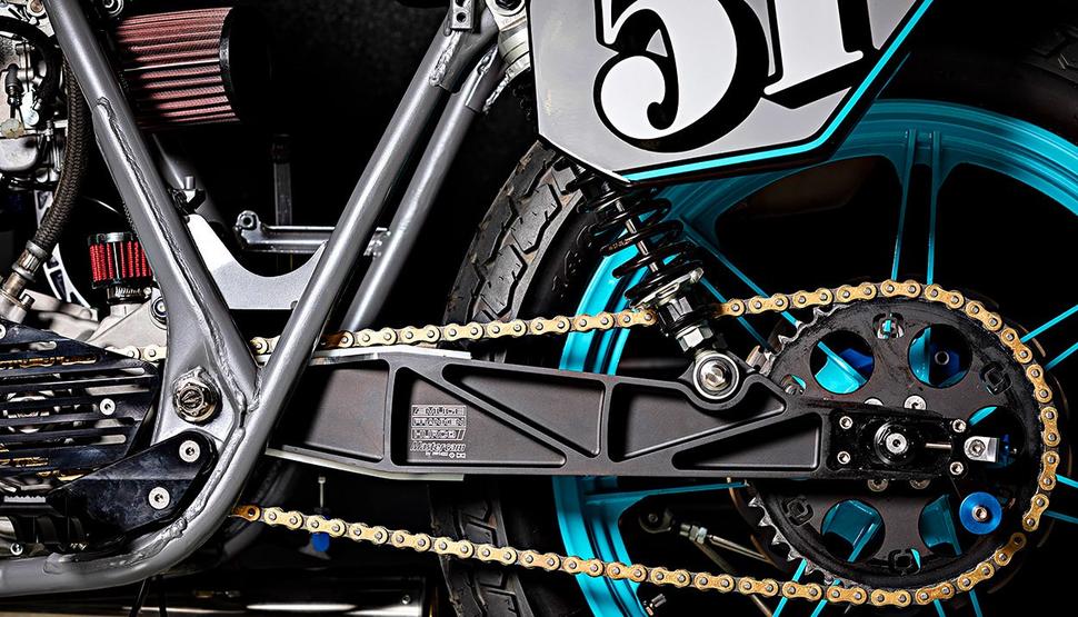 Вилка - от Yamaha XJR1200 с кастомной осью рулевой колонки, а также траверсами и проставками. Новые задние амортизаторы установлены на кастомный маятник - босс Максима попросил его сделать конкретной конструкции, дабы продемонстрировать возможности станков Hurco. Созданный совместно с компанией Mastercam, занимающейся трёхмерным моделированием, маятник разработан специально для этого мотоцикла, включая крепление проставки тормозного суппорта и втулки для подката. Мелочь, которую видно только при ближайшем рассмотрении - но таких на мотоцикле наберутся десятки - от крышек двигателя до массивных подножек и рычага кика, Максим сделал многое, но не переборщил. Приглядитесь, и увидите множество других мелочей, типа вытравленных логотипов по бокам траверс.