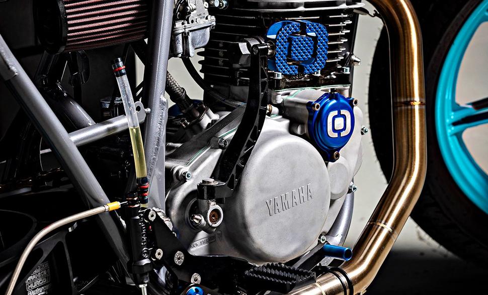 Мотор Yamaha SR500 вернулся с 540 кубами на борту и множеством внутренних доработок - в частности, модернизированный распредвал, улучшенная система смазки, карбюратор Mikuni TMR36 с фильтром K&N. Кроме того, его оснастили новым выпускным патрубком и коническим выхлопом-мегафоном от итальянцев SC Project.