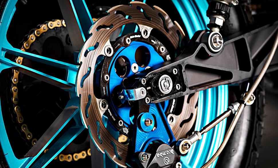 На переднем колесе Yamaha SR500 тормоза нет, а в заднем контуре установлен суппорт и главный цилиндр Brembo, соединённые армированной магистралью. Всё это Максим установил самостоятельно: штатный задний тормоз на это мотоцикле был барабанным. Для этого потребовалось сделать крепление суппорта, да и педаль гидравлического тормоза отличается от тросикового.