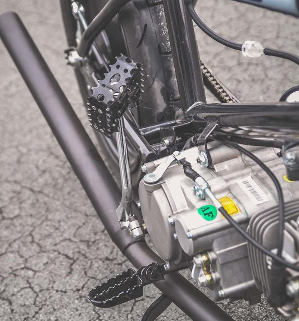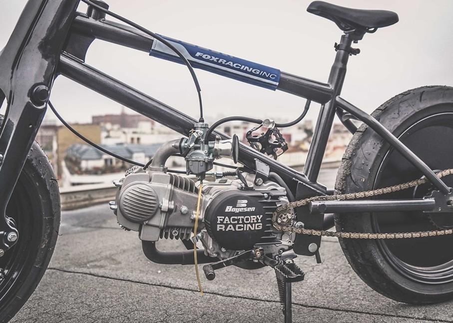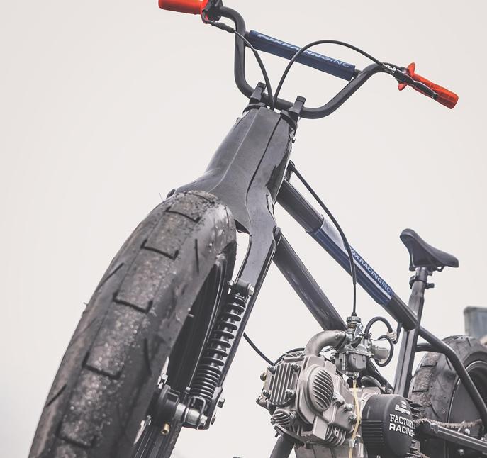 Изначальная идея заключалась в том, чтобы скрестить BMX и Honda Cub, но насчет мотора у Тома была еще более интересная задумка. Этот гибрид получил 150-кубовый двигатель YX от питбайка. Также был установлен 28 мм карбюратор Mikuni, кастомная выхлопная система и зубчатая передача.
