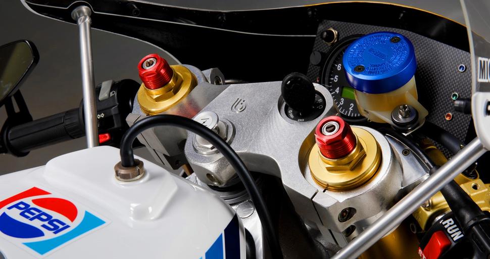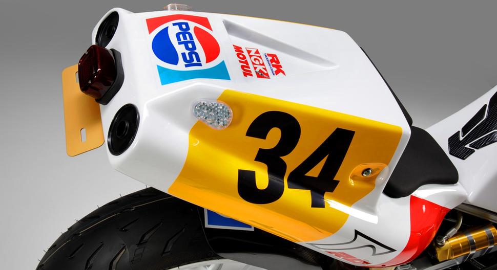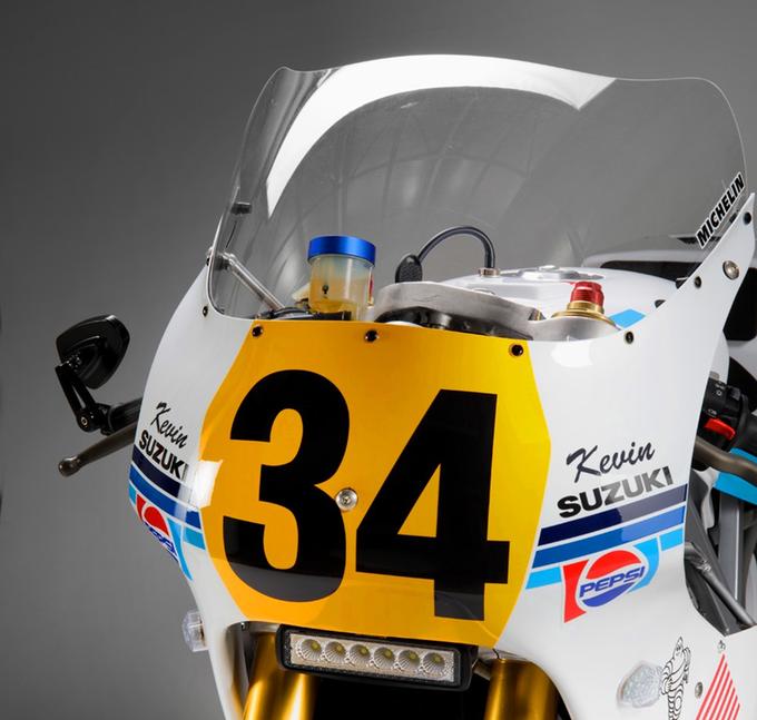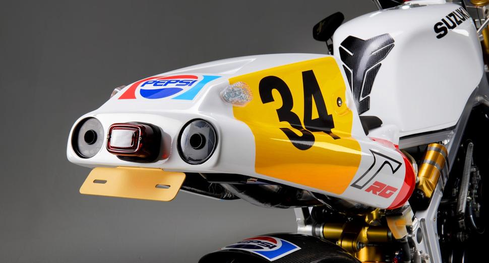 Эта райская музыка для любого фаната MotoGP 80-х требовала подобающей внешности, и единственным достойным вариантом была ливрея Pepsi/Кевина Шванца. Так что был установлен гоночный пластик от большого RG500 и карбоновый хаггер, прикреплённый к изящному маятнику.