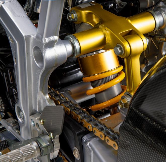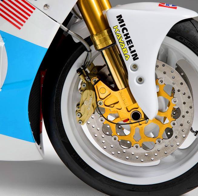 Закончив с основой, Марк всё разобрал до винтика и заказал целый ряд новых компонентов, чтобы собрать всё из надёжных запчастей. Ходовая часть мотоцикла в основном основана на изысканных компонентах от Bimota - золотая перевёрнутая вилка имеет полный набор регулировок, а установлена она в экзотических итальянских траверсах. На концах её перьев стоят суппорта Brembo с огромными дисками. Задняя часть не менее шикарна - там стоит великолепный по меркам своего времени Ohlins.