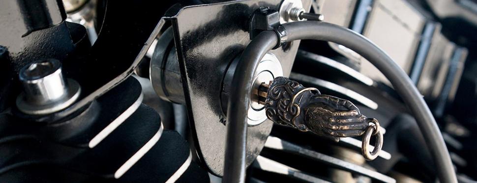 Замок зажигания расположен между головок V-образного двигателя, а его единственный в своём роде ключ изготовили токийские ребята из Yoshinori Komiyama.