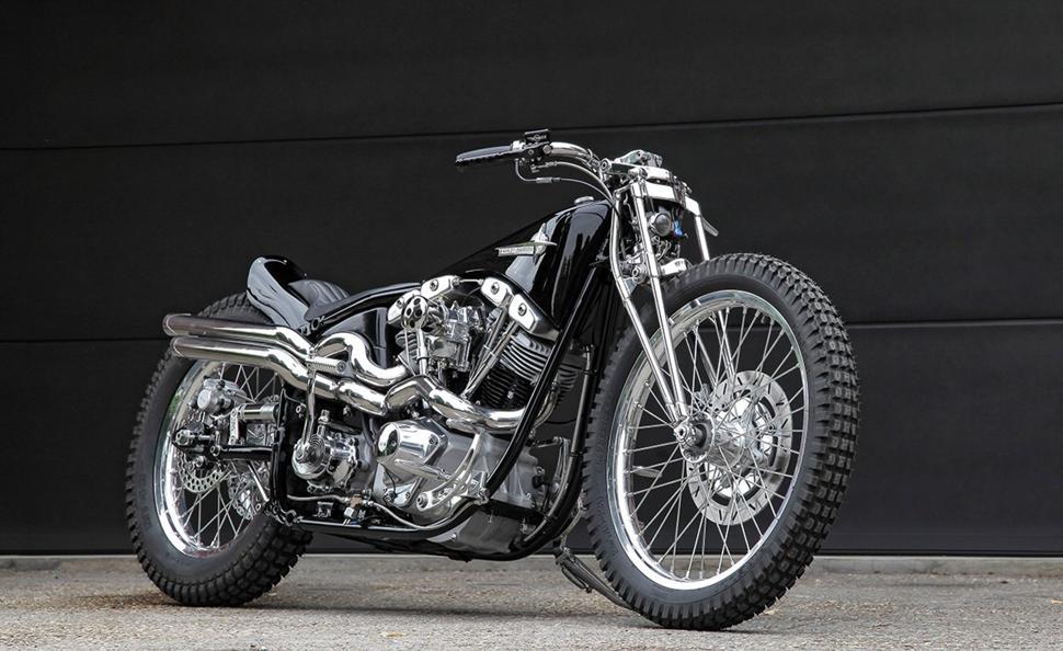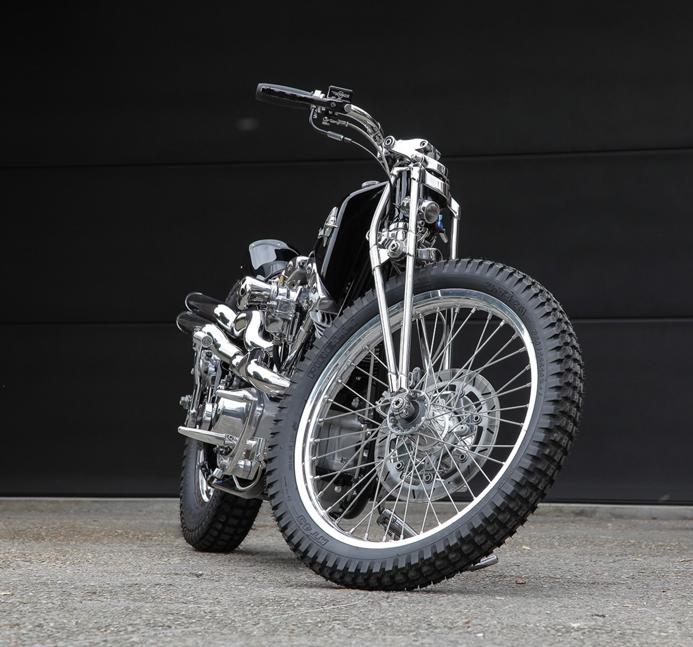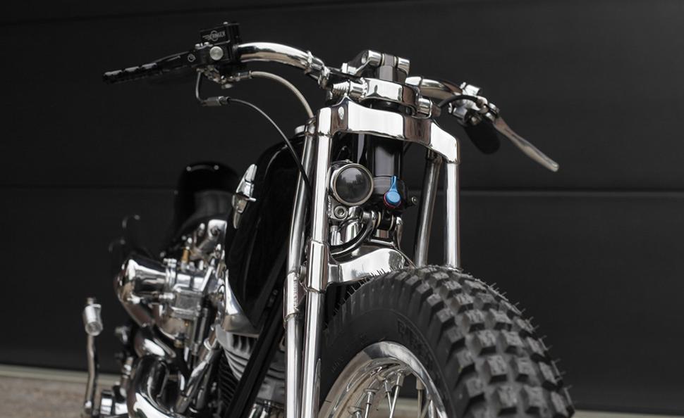 Для своего нового проекта Сэмюэль выбрал железного коня из Милуоки. Ему в голову пришла идея сделать низкий и узкий чоппер с колесами от мотоцикла для эндуро. Не традиционный подход, но результат впечатляет. Задняя часть рамы Shovelhead была переделана таким образом, чтобы получился узкий и прямой профиль. Модифицированное шасси стало на 50 мм ниже и на 38 мм уже по сравнению c тем, что вышло с завода в Милуоки в 1972 году. Сэмюэль объясняет: