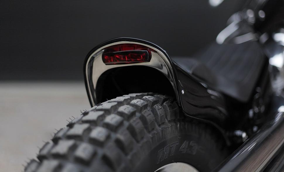 Завершив и установив невыносимо элегантную вилку, Сэмюэль принялся за колеса. Он изготовил новые ступицы, ободы взял от эндуро мотоцикла Husqvarna 125 размером 21/18. Они гораздо легче, чем оригинальные диски. Тормозные суппорты Nissin соединяются с главным тормозным цилиндром Beringer. Для передней фары Сэмюэль сделал компактную светодиодную фару и установил ее между перьями вилки. Отполировав каждый миллиметр колесных дисков, мастер надел на них резину Pirelli MT43. Рисунок протектора шин подходит и для эндуро, и для твёрдых поверхностей. К тому же шины допущены к использованию на дорогах общего пользования. Массивные шины прекрасно дополняют зализанный Shovelhead.