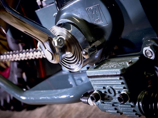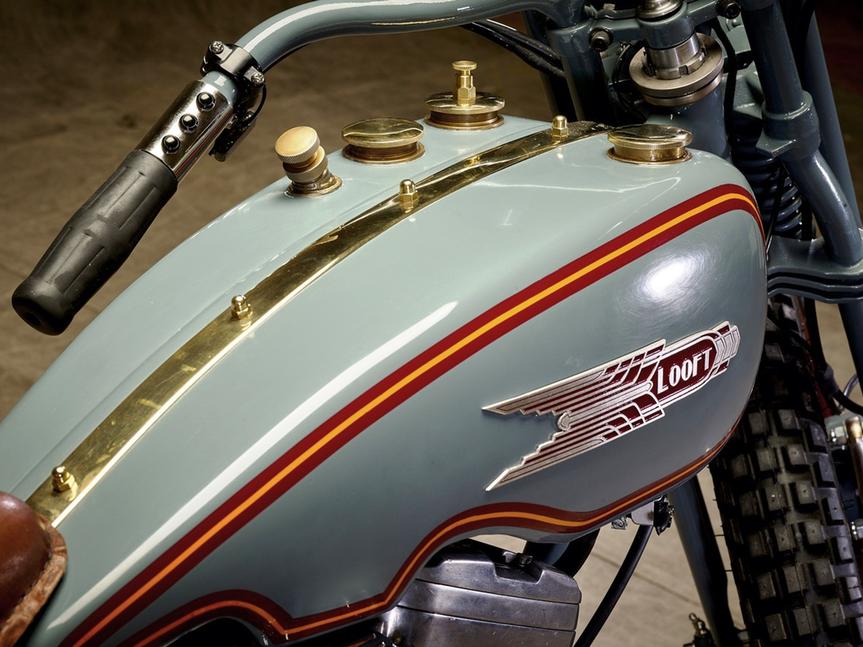 Дополнительное пространство, возникшее из-за удлинения задней части рамы, позволило не только установить маслобак, но и переместить коммутатор зажигания на другую сторону центральной стойки. Бак сам по себе является произведением искусства - от бронзовой ленты и фитингов, включая поршень - и до силуэта, обнимающего двигатель.