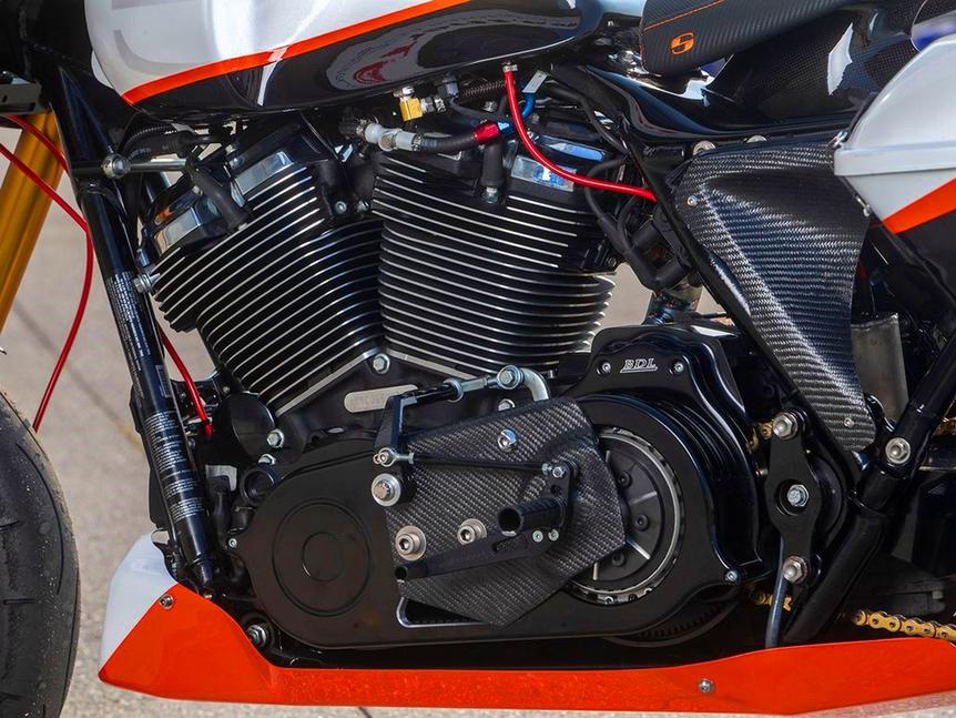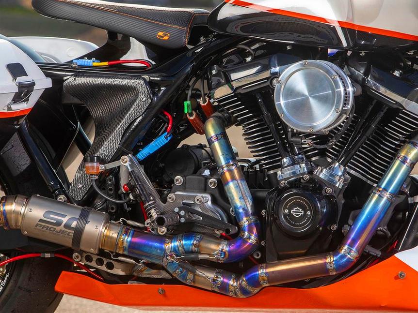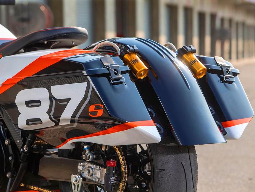 Правила гонок довольно расплывчатые: мотоциклы участников должны "в принципе" выглядеть как бэггеры. С неоценимой помощью специалиста по карбоновому обвесу Пола Тэйлора Вули создал обтекатель в стиле Road Glide, но на 8см уже и на 10см ниже, чем стоковый, и с карбоновой внутренней частью, сэкономив 1,4кг веса. Кофры были тоже сделаны вручную, и благодаря скошенным днищам они позволяют ниже наклонять мотоцикл и имеют более аэродинамичную форму. Каждый из них весит вместе с крышкой около 1,4кг. Карбоновые крылья и защита картера добавили 3,5 кило, а полностью карбоновый бак весит менее 3кг. С кастомным хром-молибденовым подрамником, обновлённой проводкой, титановыми метизами и другими облегчениями было сэкономлено ещё почти 3 кило, и в итоге 385кг оригинального Road Glide превратились в 242, обретя к тому же доступные углы наклона в 61 градус.