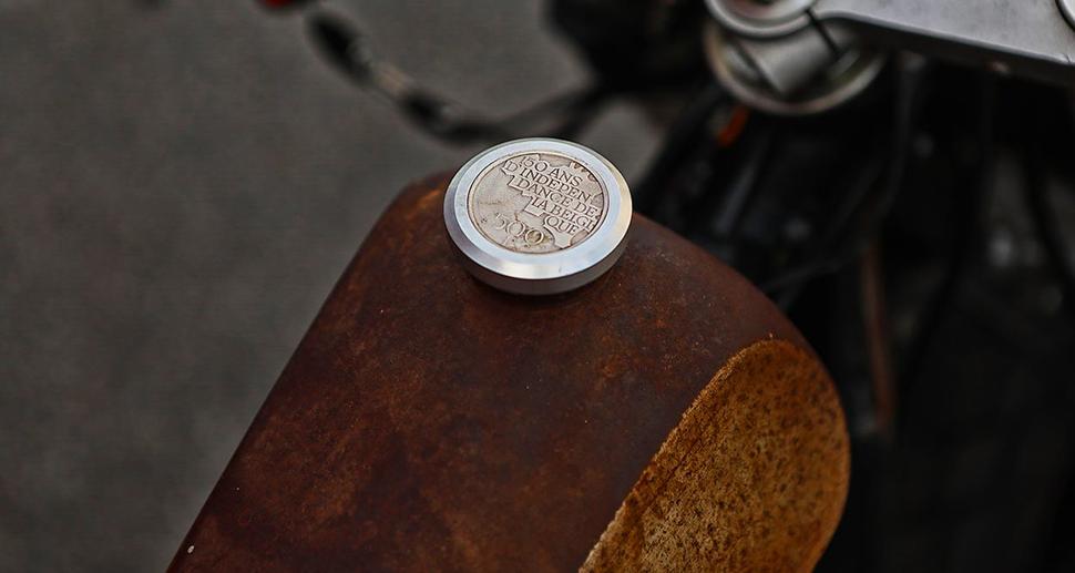 Бак неизвестного происхождения, судя по всему, раньше стоял на винтажном мопеде и до сих пор хранит следы винтажной патины и памятную 500-франковую монету 1980-го года, встроенную в крышку.