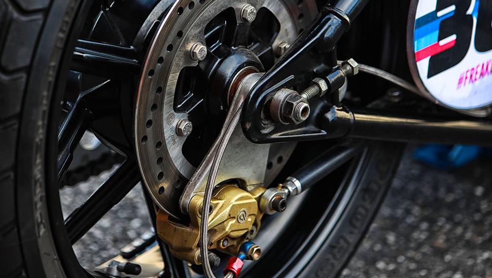На переднее поставили второй тормозной диск, а заднее пришлось существенно доработать под Harley-евский маятник. На фотографиях колёса обуты в штатную резину Ducati Scrambler - Pirelli MT60, но Руди гоняется на трековых Michelin-ах.