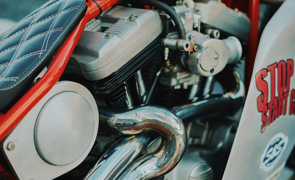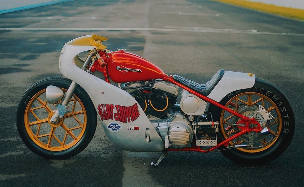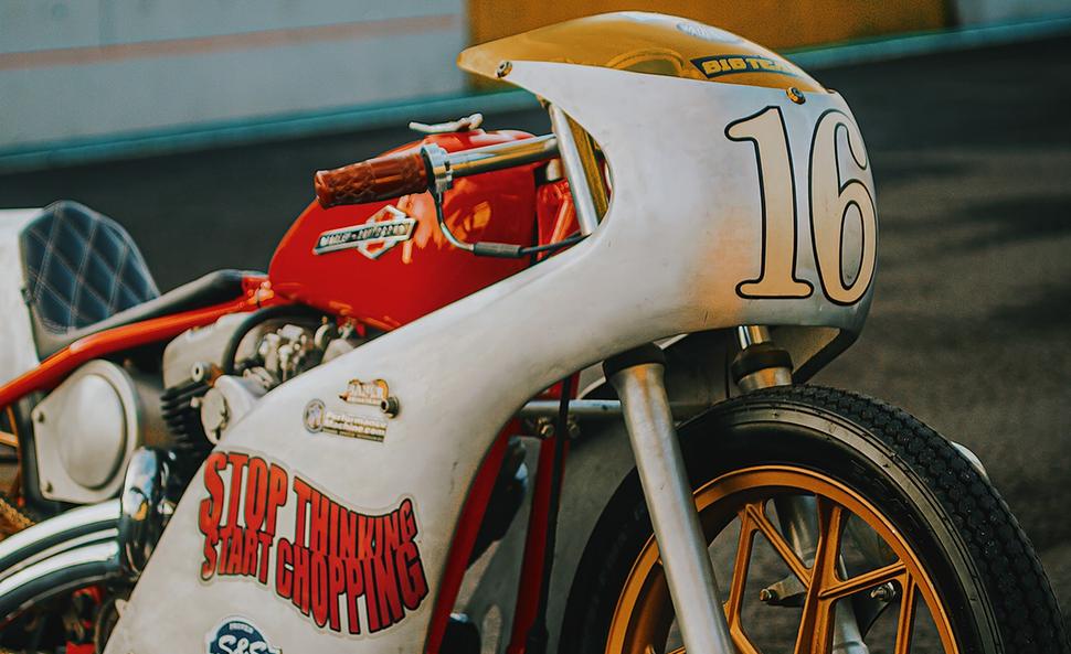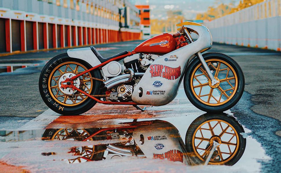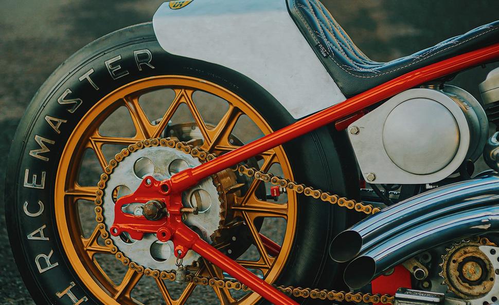 18-дюймовый слик M&H Racemaster обут на заднее колесо, а на переднем красуется 19-я Shinko E240. Но колёса - лишь часть истории: в своём стремлении к минималистичной дрэгстерной эстетике Хери установил мотор Sportster в самодельную сухую раму.