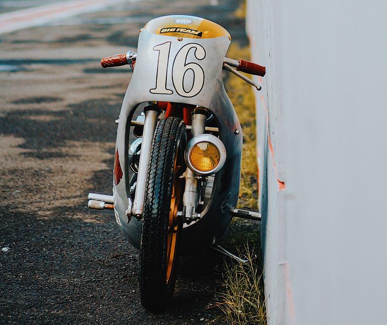 Маслобак Mooneyes спрятан под сиденьем, а внизу с левой стороны расположен самодельный отсек для аккумулятора. Небольшие вырезы по бокам обтекателя обеспечивают пространство для свободного движения педали тормоза и рычага коробки.