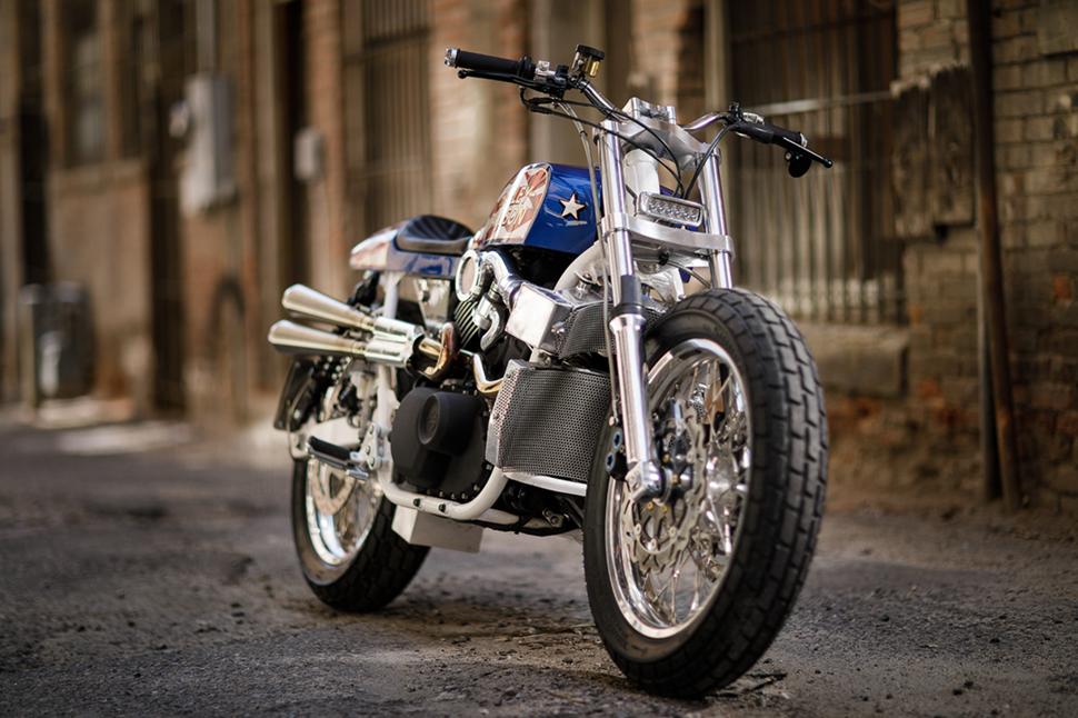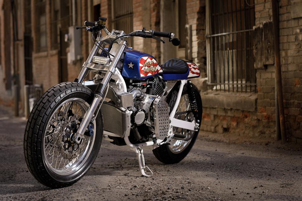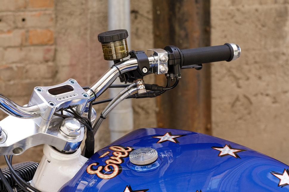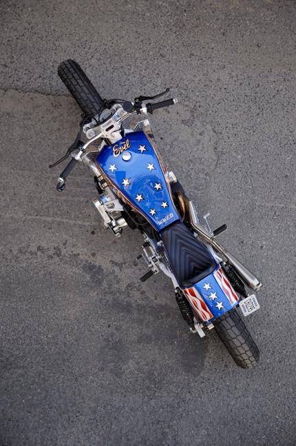В основу дизайна мотоцикла лёг Harley Davidson XR750. Колин сделал алюминиевый бак в стиле XR, хвост в том же духе, установил в него диодные задние огни. На баке красуется выведенная вручную аббревиатура W.W.E.D - Что Бы Сделал Ивел (не задавайте себе этот вопрос на дорогах!)